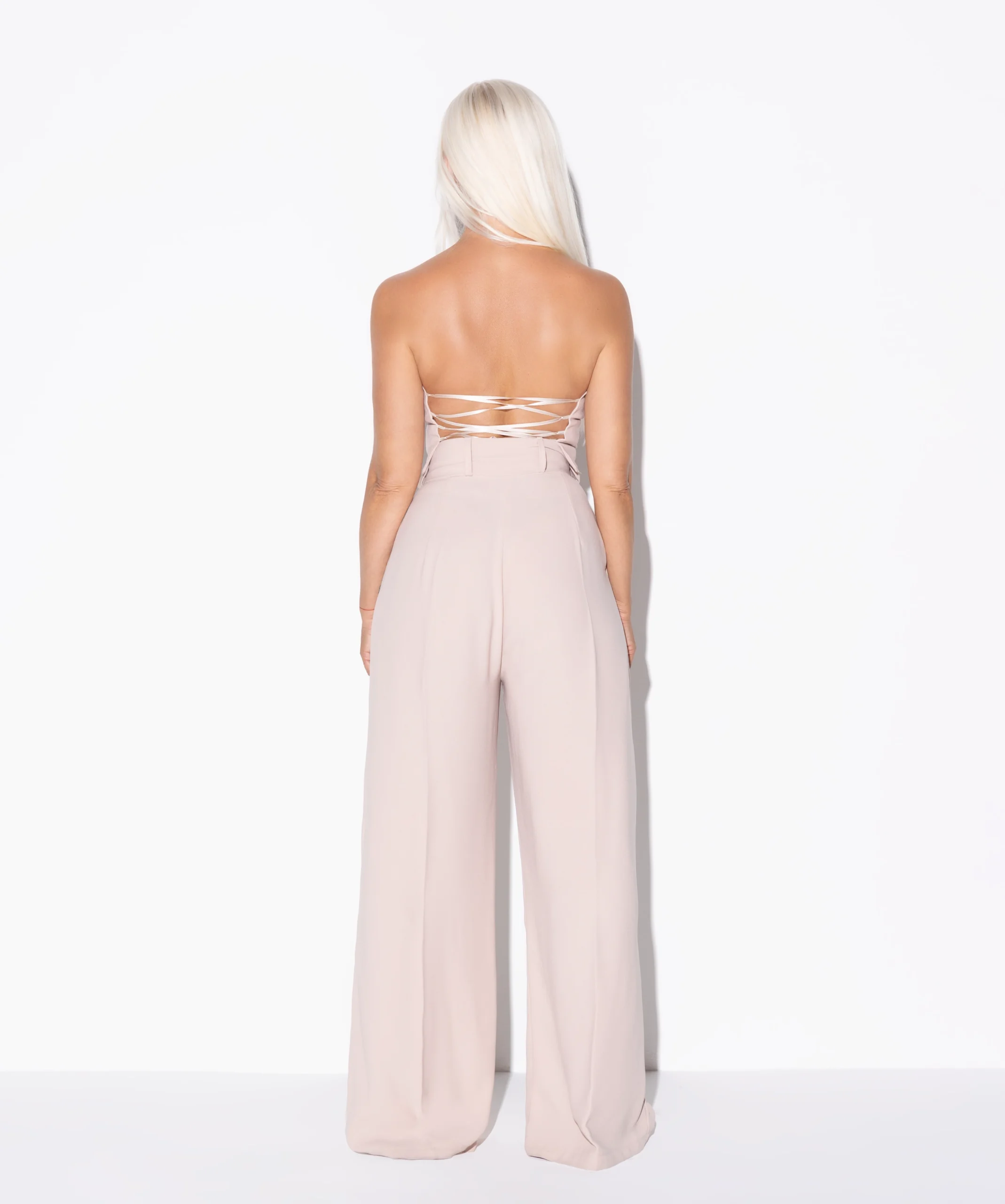 Komplet korset i pantalone. Korset se pertla pozadi, a pantalone su sa visokim strukom i širokim nogavicama. Vanvremenski odevni komad koji nikad neće izaći iz mode.
