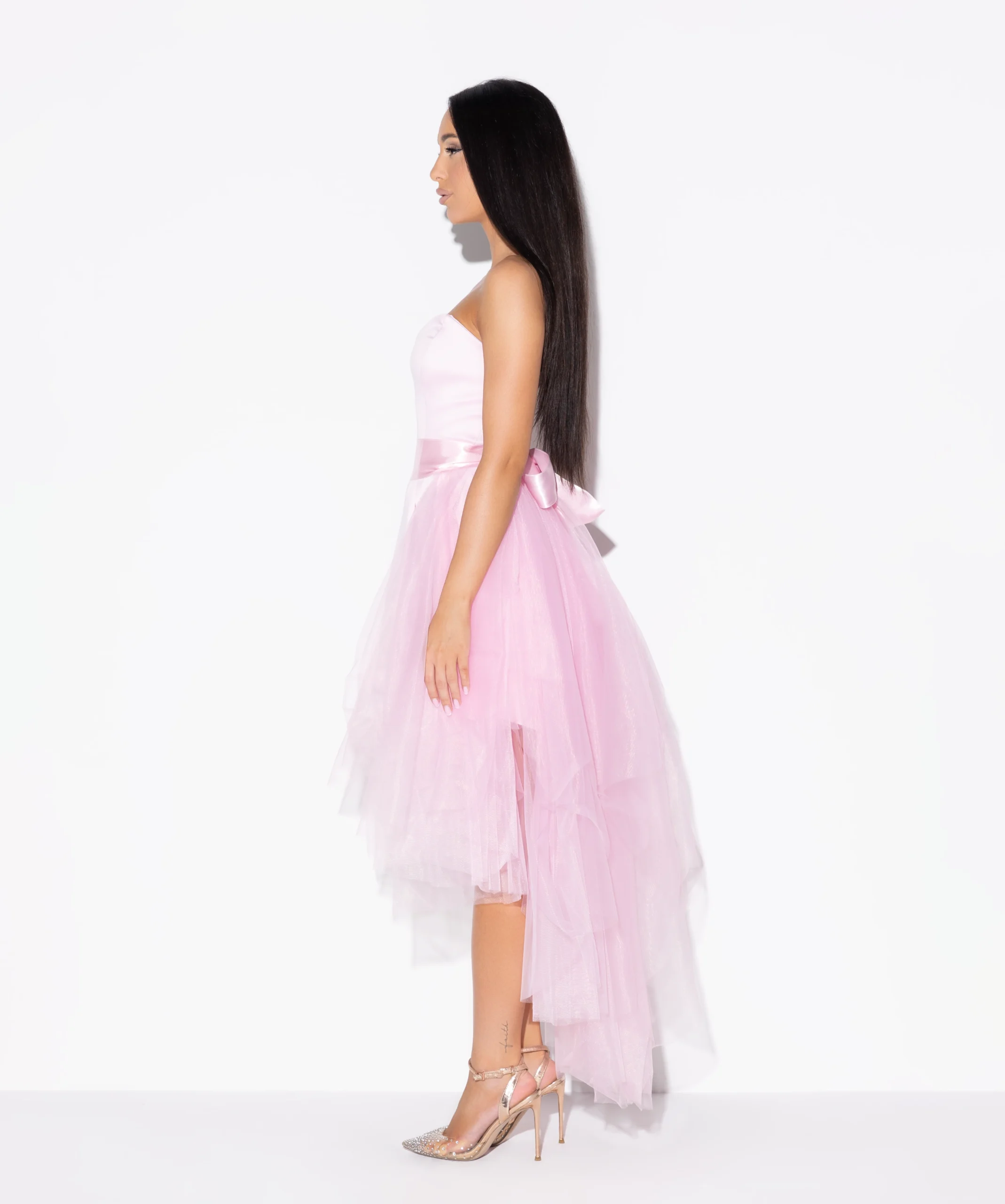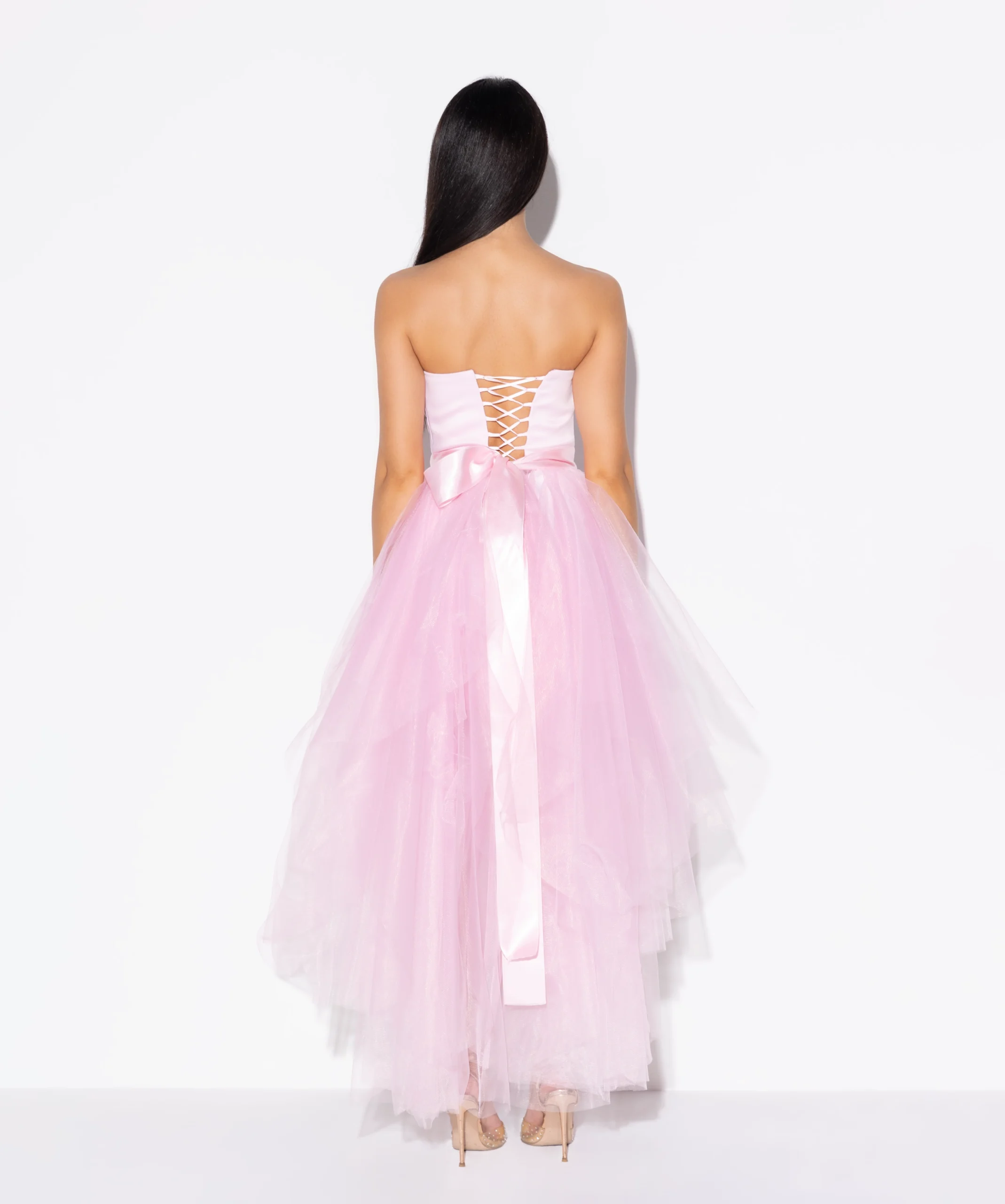 Korset haljina ojačana u gornjem delu sa pertlanjem pozadi. Haljina dolazi sa elegantnim šlepom od tila koji se može skinuti i time dobijate dve različite odevne kombinacije u jednom modelu. Kada poželite sveden izgled, jednostavno ga skinite i dobijate potpuno novu haljinu.