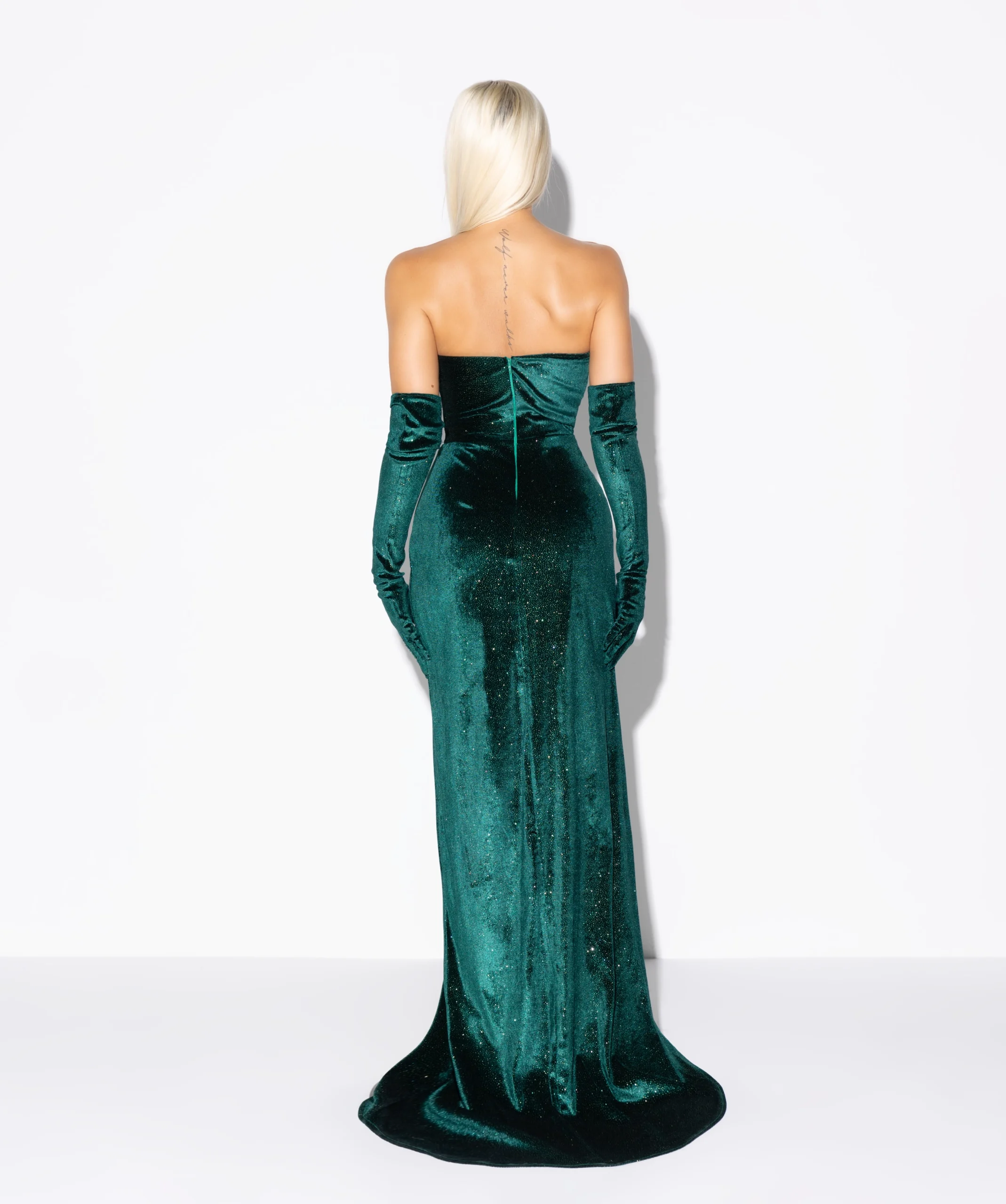 Nesvakidašnji model haljine sa dubokim šlicom i rukavicama, dizajnirana za izuzetne prilike. Gornji deo je vrlo unikatnog kroja, sa naglašenim špic oblikom dekoltea. Vanvremenski model. Haljina govori sama za sebe.