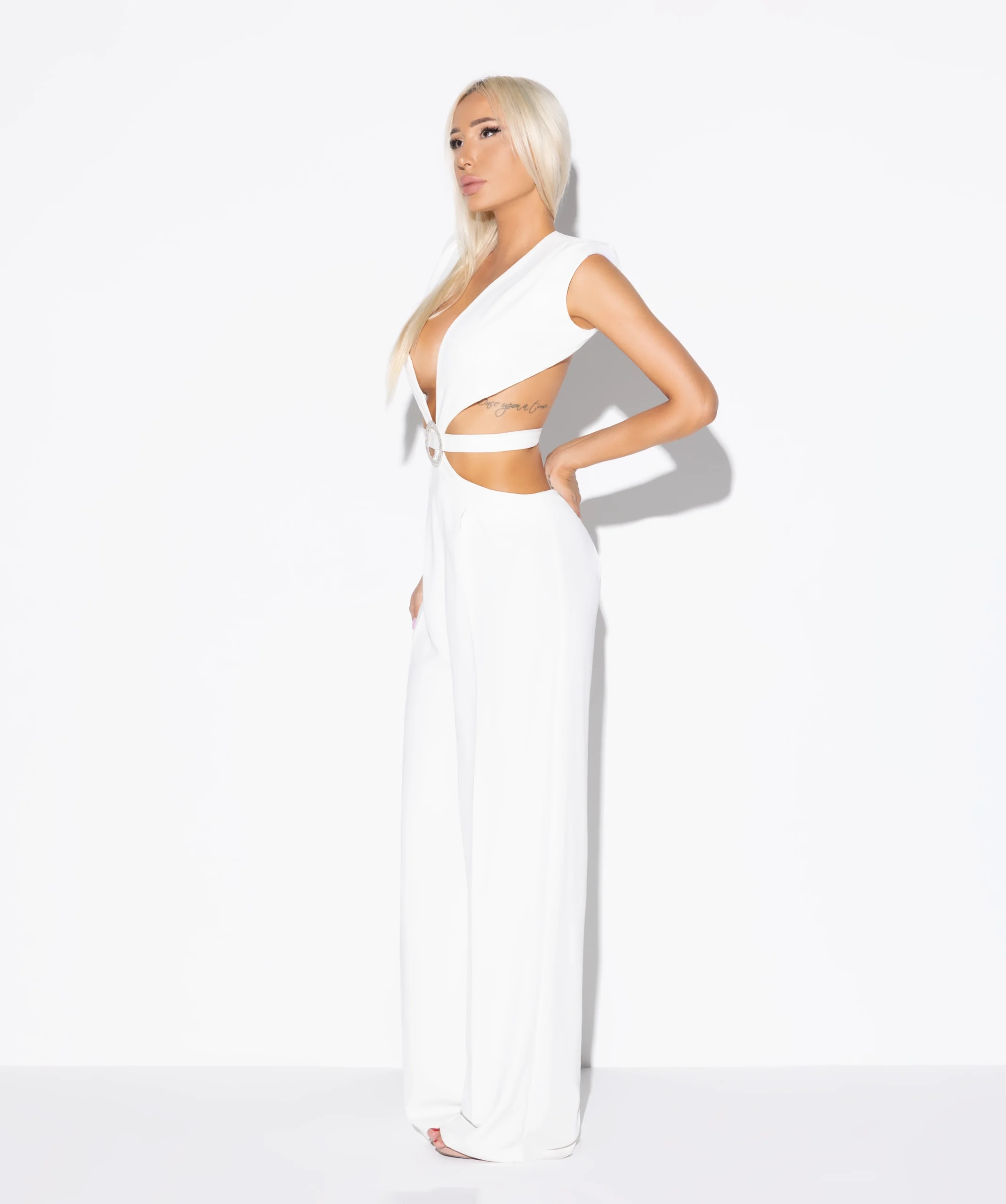 Kombinezon sa naglašenim ramenima, prorezima i pojasom sa šnalom od kristala koji vizuelno definiše struk. Gola leđa daju sofisticianu i elagantnu liniju samog modela. Duge nogavice vizuelno produžuju siluetu tela.