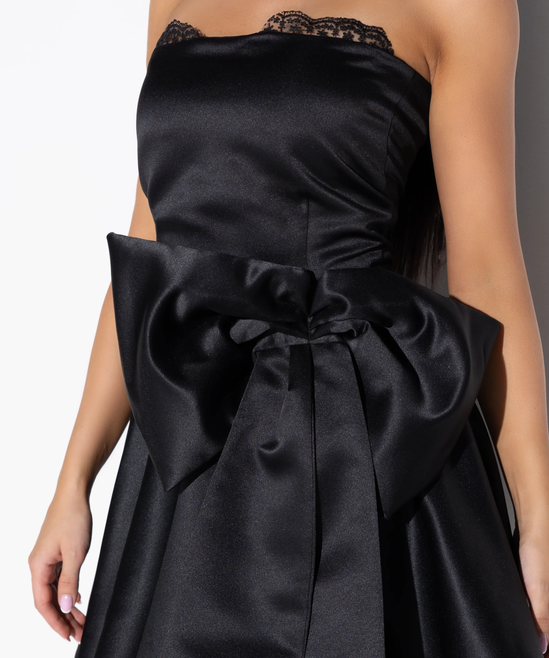 Top haljina sa čipkom koja se suptilno nadzire u predelu grudi, i raskošnom mašnom na sturku. Pozadi je sa skrivenim pertlanjem. Idealan izbor za svečane prilike.
