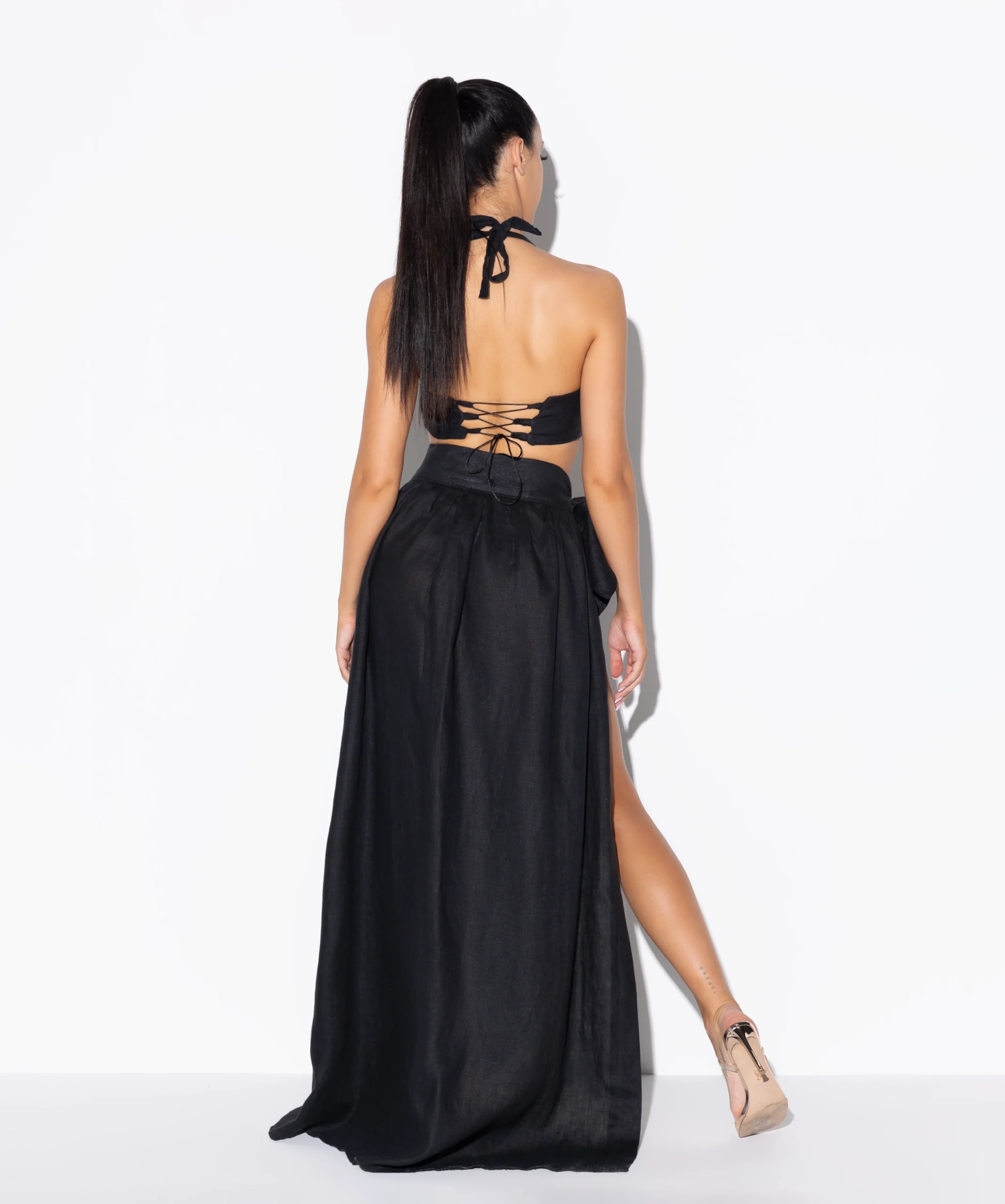 Komplet suknja i top. Suknja je visokog struka i dubokog šlica, dok je top pozadi na pertlanje sa raskošnim cvetnim detaljima. Set je idelan za elegantne ail i dnevne varijante.